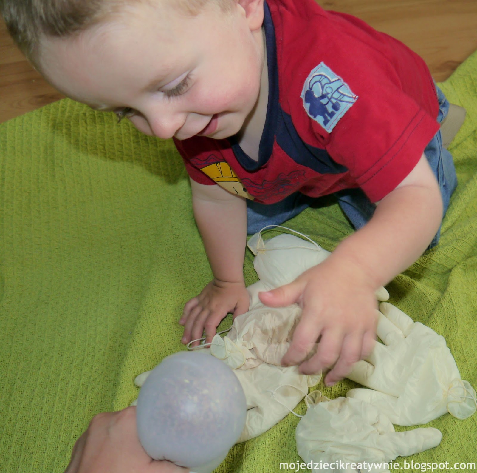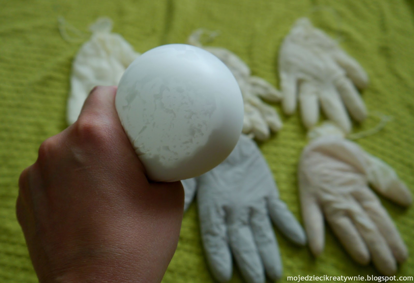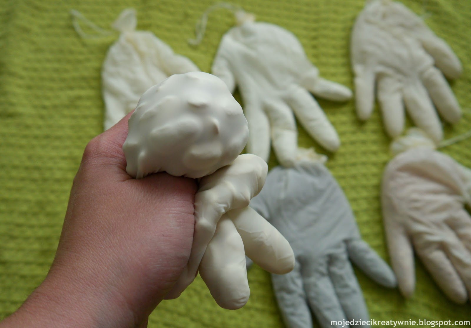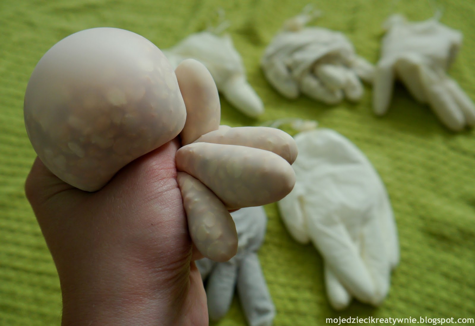 Można również użyć rękawiczek winylowych, są mocniejsze i bardziej przezroczyste. Zabawa jest na tyle kreatywna i innowacyjna, że świetnie sprawdza się również w grupie dzieci, podczas różnych ćwiczeń i zabaw ruchowych. Dzieci próbują iść z rękawiczką na głowie w taki sposób, aby nie spadła. Podrzucamy rękawiczkę jak najwyżej i próbujemy ją złapać. Idziemy stopami po rękawiczkach tak, aby nie dotykać dywanu.