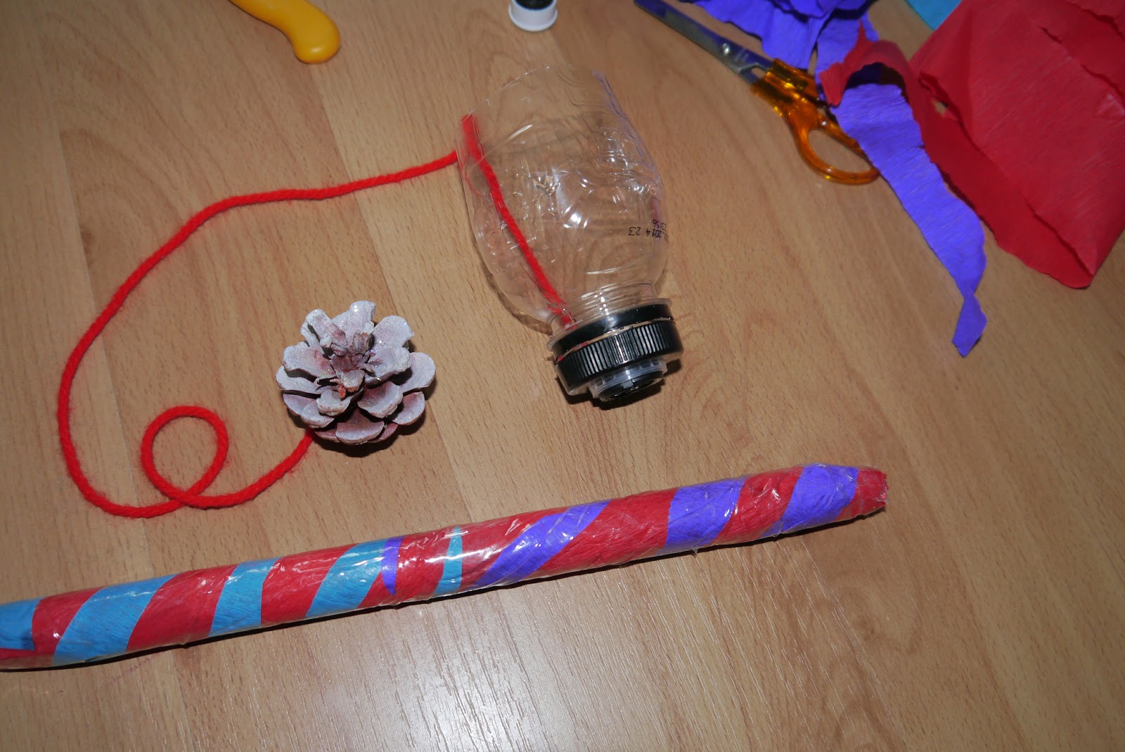 patyk, mała butelka z dzióbkiem, sznurek, szyszka lub kulka, bibuła lub papier kolorowy do ozdobienia, nożyczki, nożyk, taśma.