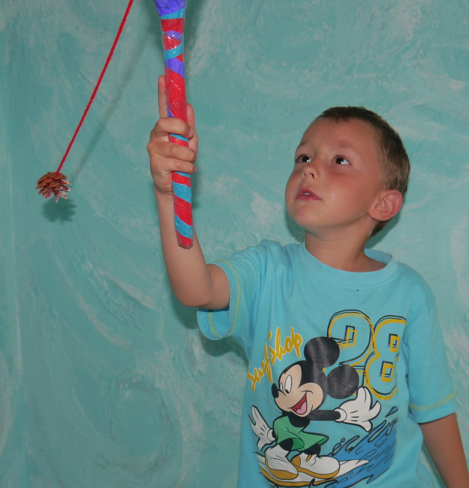 Ścinamy nożykiem dzióbek z butelki, zakręcamy zakrętką sznurek, a z drugiej strony mocujemy go do szyszki. Tak przygotowany kubeczek do łapania szyszki mocujemy za pomocą taśmy do patyka i oklejamy papierem dekoracyjnym, plasteliną, lub malujemy farbkami:-)