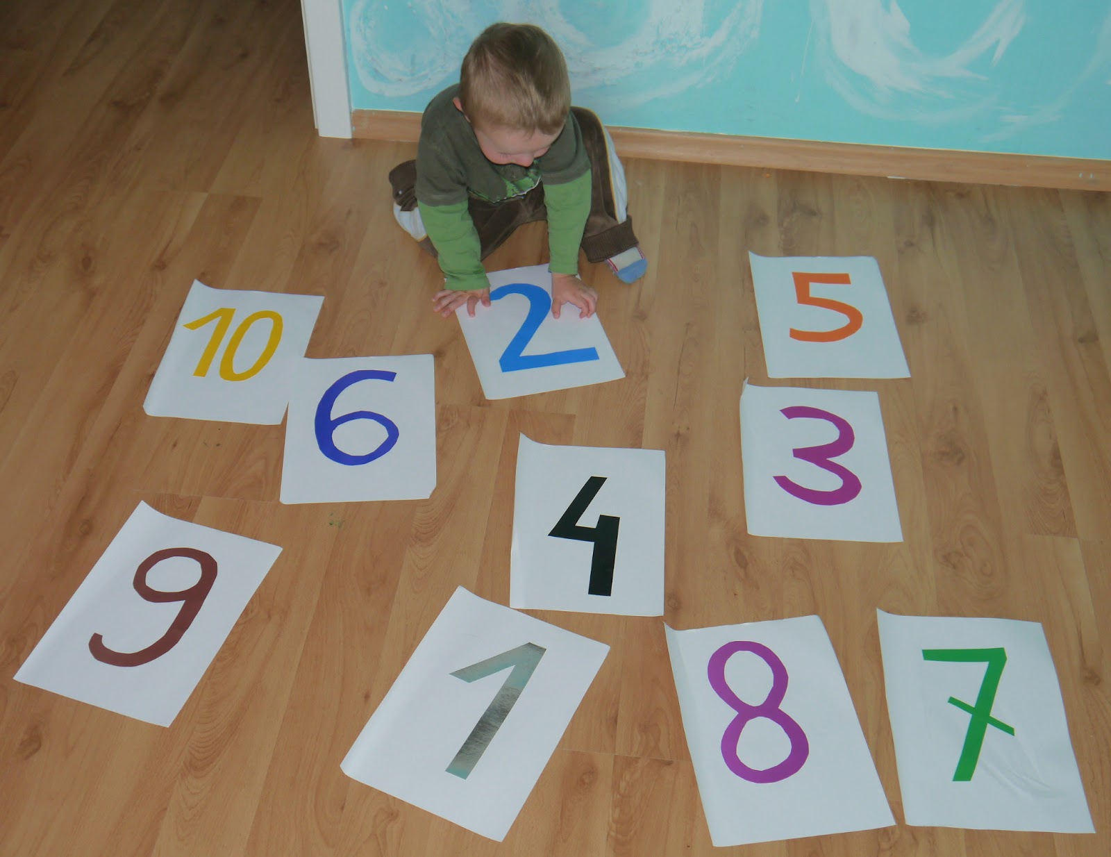 Michał jest na etapie poznawania cyferek od 1 do 10. Przygotowałam na dużych kartach A4 duże cyfry. To, co jest ważne każda w innym kolorze, gdyż to znacznie ułatwia dziecku rozróżnianie.