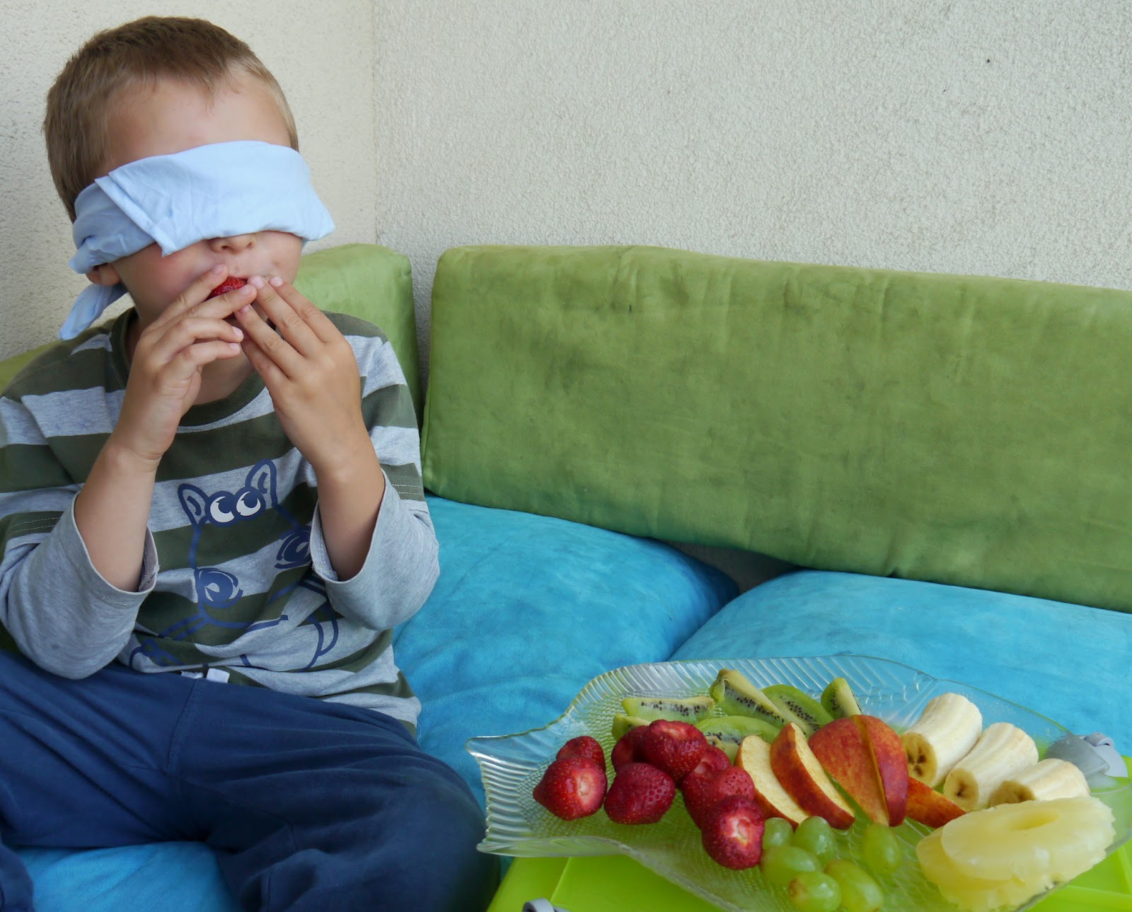 Rano w ramach drugiego śniadanka postanowiłam pobawić się z Adasiem w zgadnij jaki to owoc. Ponieważ pogoda piękna, to rozłożyliśmy sobie na balkonie poduszki, zrobiliśmy stolik ze skrzyni na zabawki i przystąpiliśmy z zapałem do ucztowania.