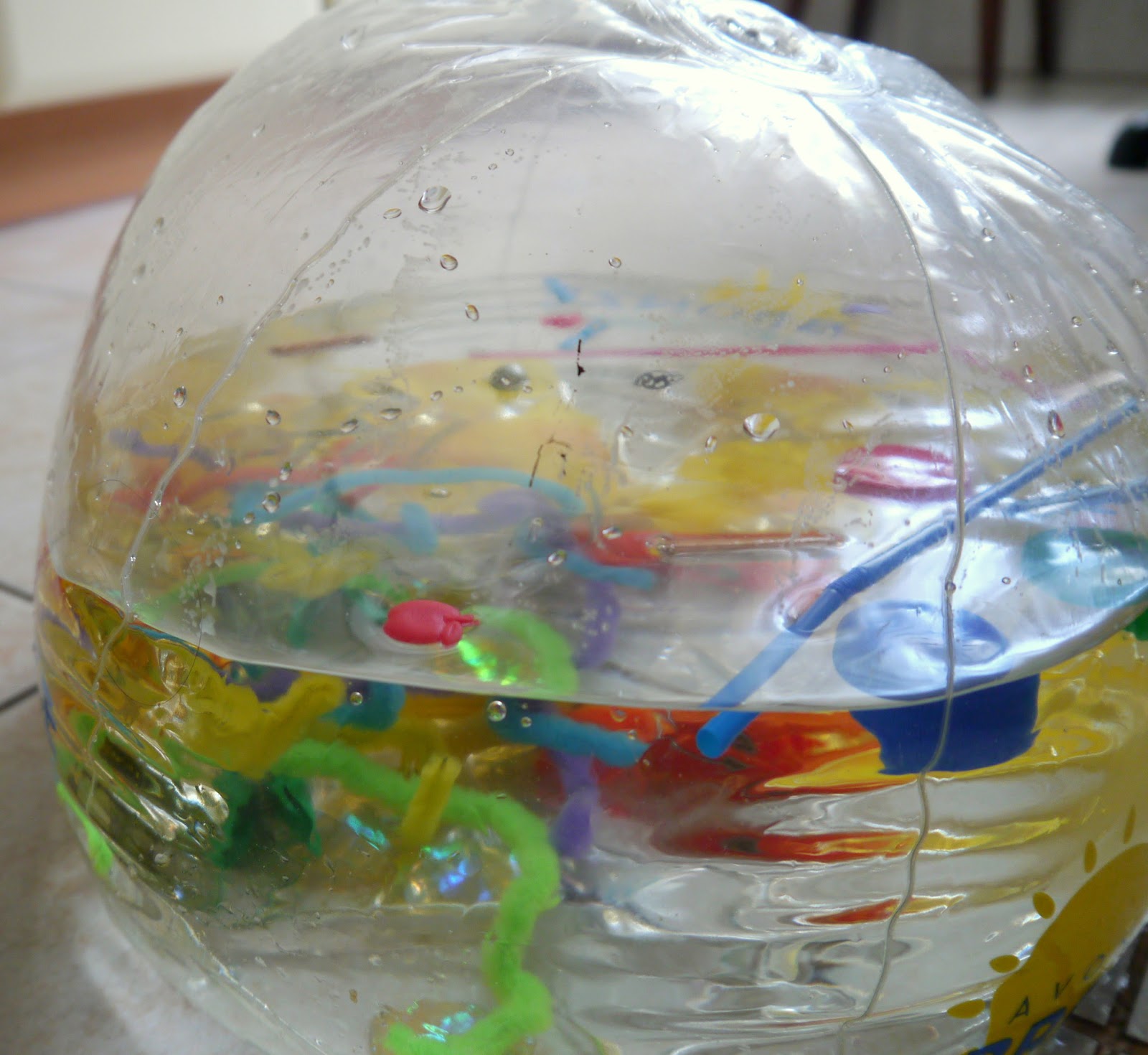 Kolejna opcja to dolać trochę wody, a w resztę wolnej przestrzeni w piłce nadmuchać powietrza, wtedy piłkę można kulać, toczyć , kłaść się na nią jeśli dziecko jest małe i również obserwować co się dzieje w środku.