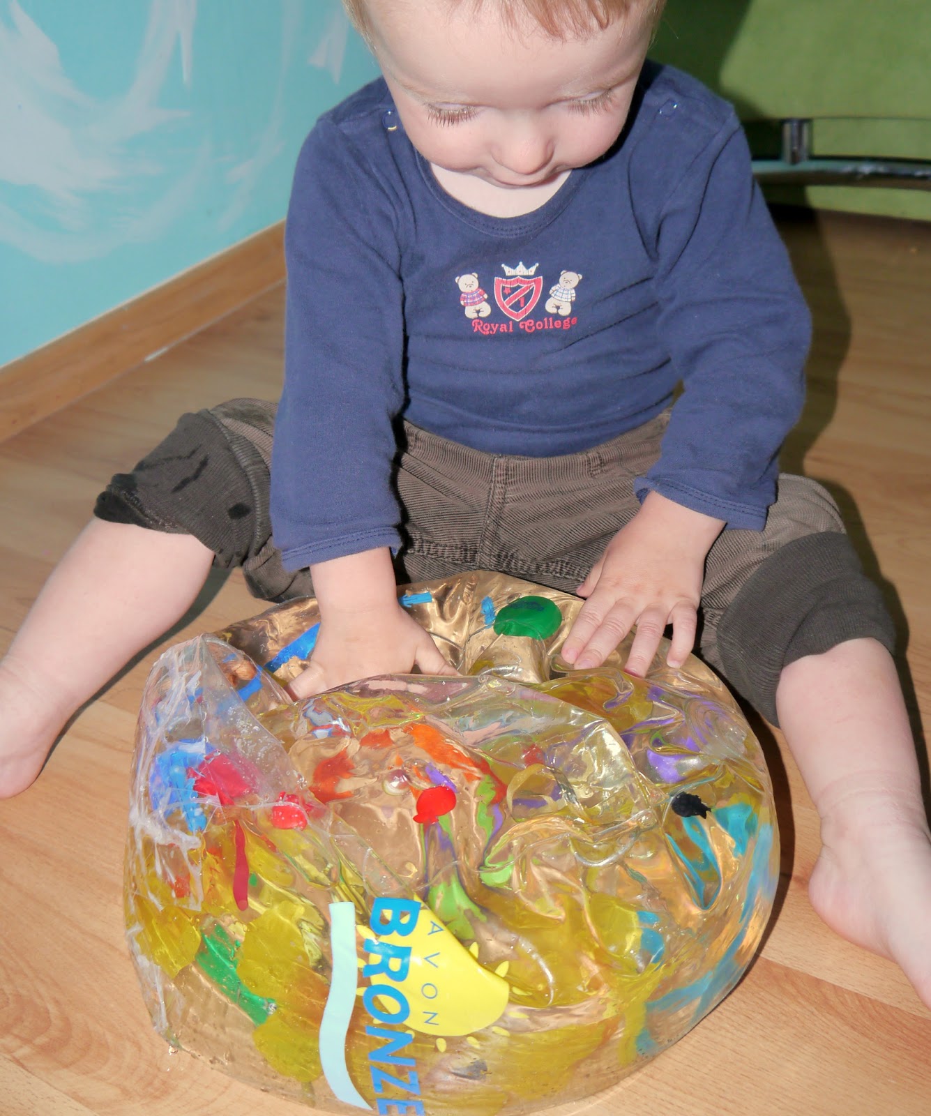 Wariantów zabawy jest kilka nalewamy trochę wody bez powietrza i wtedy bawimy się dotykając piłkę, zgniatając ją, obserwując jak przedmioty się zachowują, przelewają, przesuwają itp. Można też taką piłkę wziąć ze sobą do wanny i jest również bardzo fajna zabawa.