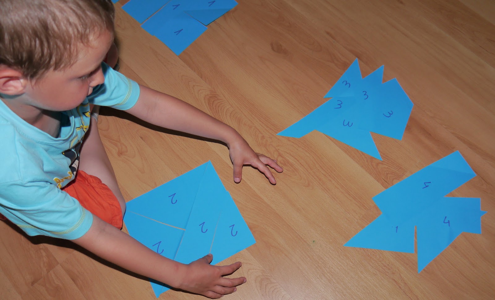 Każdy kawałek kwadratu, jest oznaczony cyferkami. Najpierw Adaś układa elementy kwadratów według cyferek, w dalszej kolejności z posegregowanych figur układa kwadraty. Zabaw nadaje się dla dzieci w rożnym wieku. Dla młodszych wystarczy przecinać kwadraty na pół, po skosie lub na prostokąty. Dla starszych dzieci dzielimy na rożne elementy i na taką ilość aby dostosować do możliwości i wieku dziecka:-)