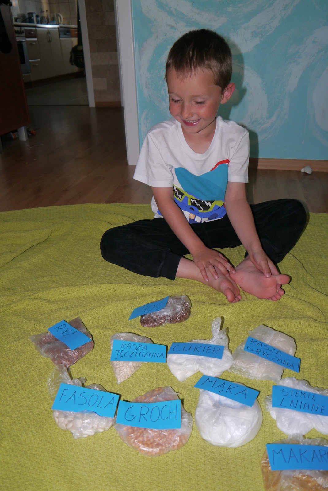 Temat pojawił się gdy synek powiedział, że kaszę czy siemię lniane to łatwo rozpoznać po kolorze, ale uświadomiłam mu, że z zawiązanymi oczami nie widać kolorów i trzeba zapamiętać po dotyku. W ten sposób synek zrozumiał jak trudno musi być osobą niewidomym poznawać świat.