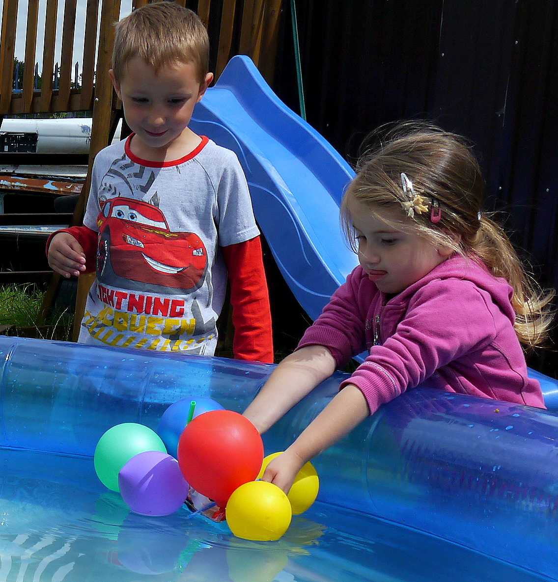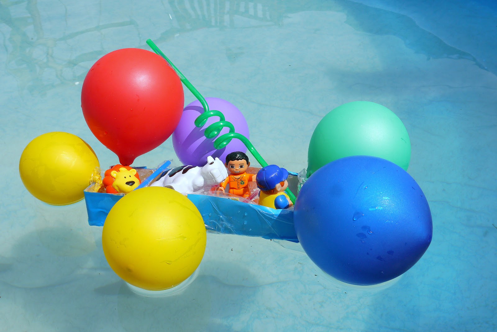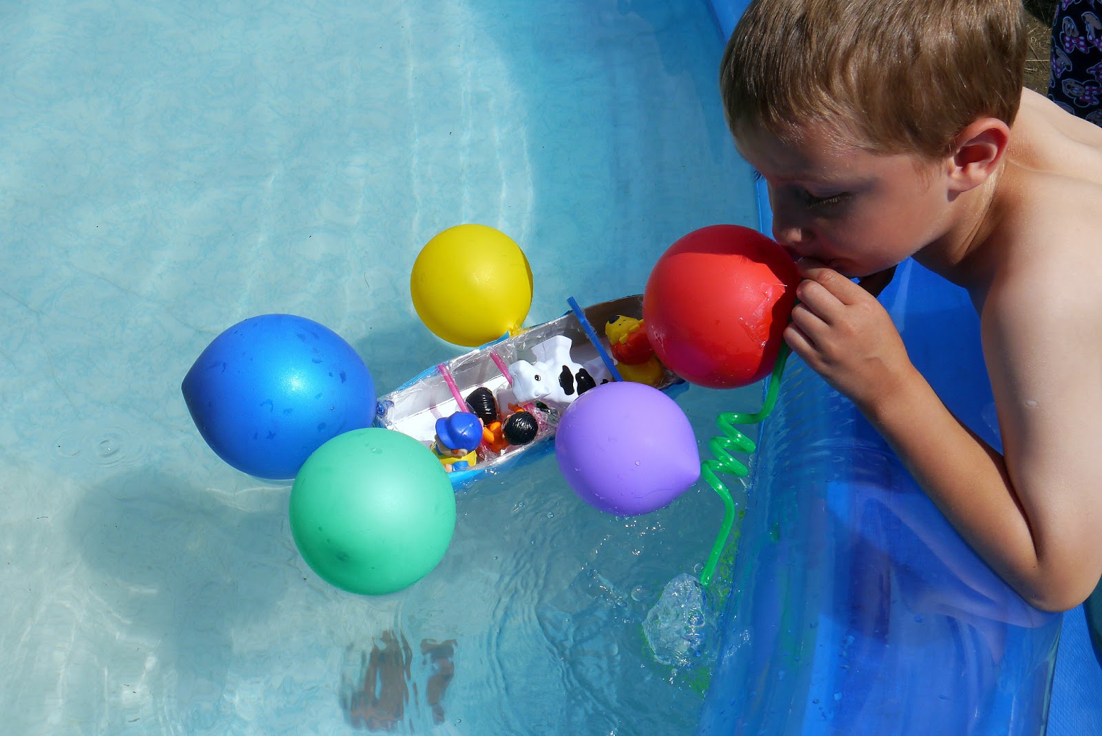Wykonana z kartonika po mleku, które zostało przecięte na pół i ozdobione papierem. Następnie przykleiliśmy do niego nadmuchane lekko balony i rurkę. Tak powstał statek z napędem balonowym. Aby statek był turbodoładowany, Adaś dmuchał w słomkę puszczając bańki powietrzne pod wodę:-)