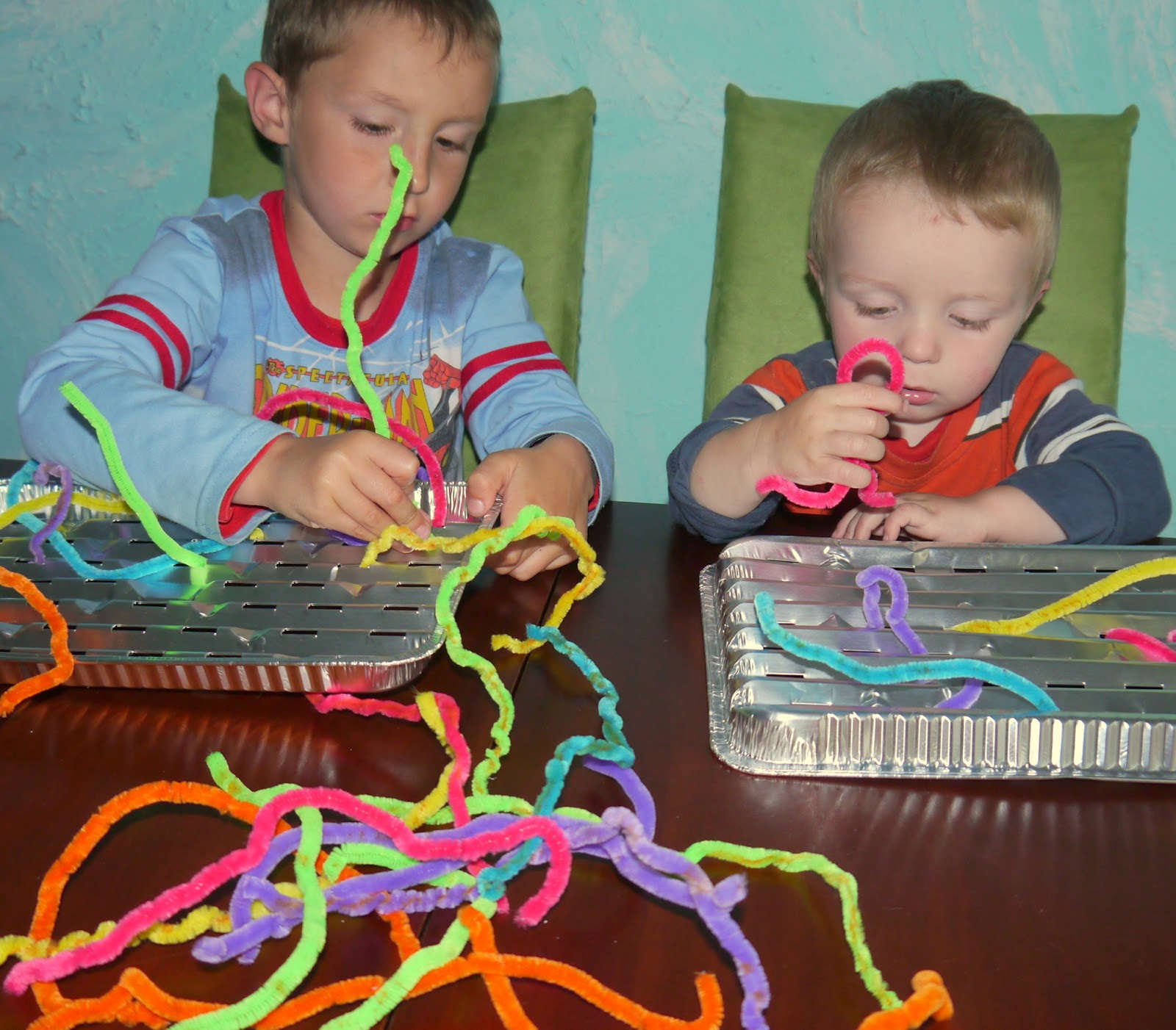 Druciki kreatywne i tacka grillowa, to wszystko czego potrzebujemy, aby rozpocząć bardzo prostą manualną zabawę. Dzieci podczas przewlekania drucików przez dziurki w tackach tworzą różne ciekawe kompozycje. Starsze dzieci mogą w ten sposób stworzyć ciekawe kompozycje i rzeźby przestrzenne, a nawet budowle łącząc ze sobą za pomocą drucików kilka tacek.