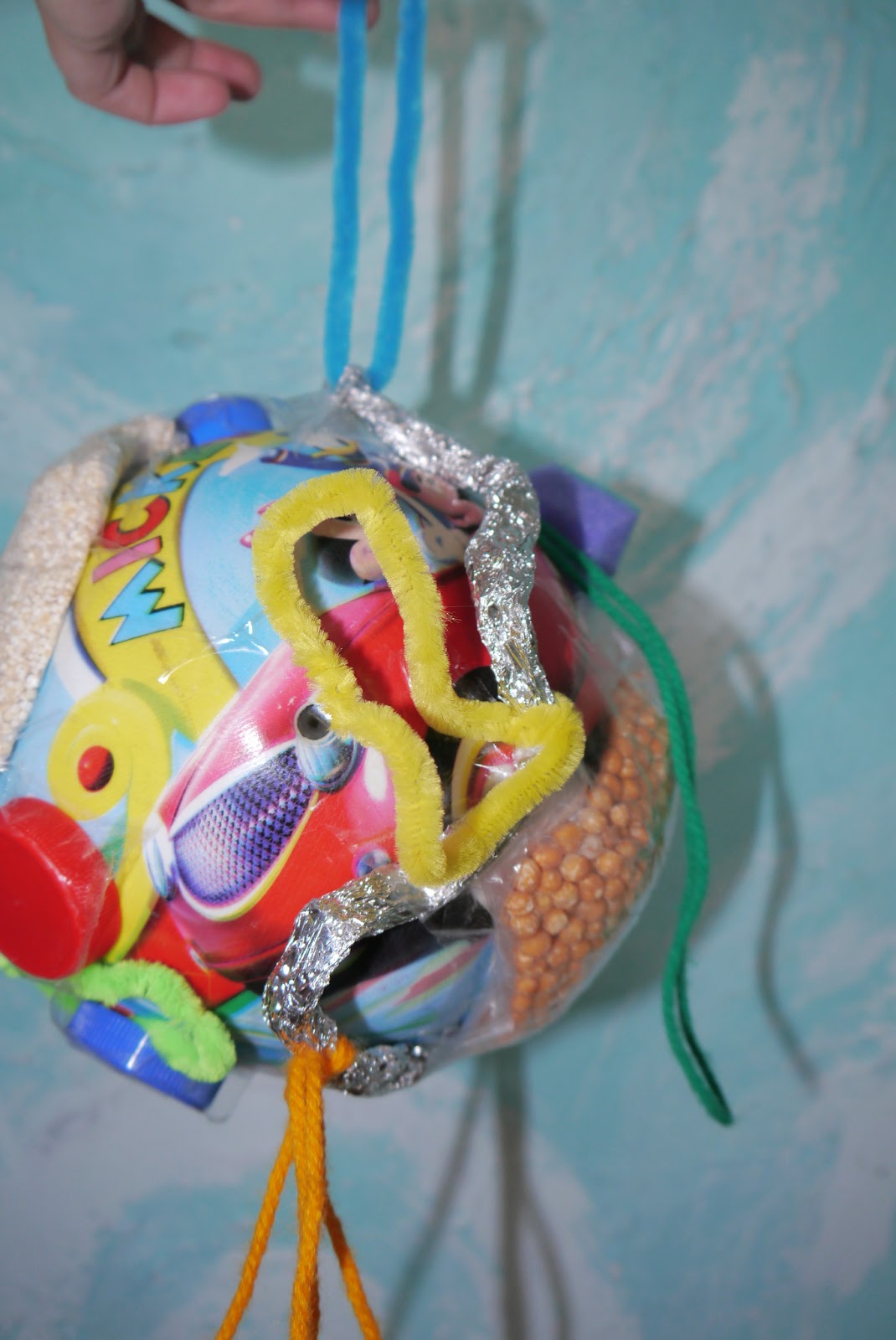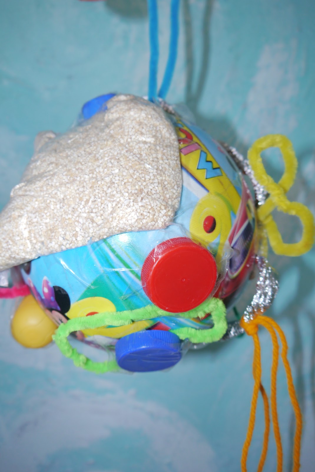Taśma klejąca, rzeczy o różnej fakturze, gąbeczki miękkie i szorstkie, kawałek futerka lub czegoś pluszowego, piórko, koraliki, druciki kreatywne, sznureczki, tasiemki, ryż, kasza, groch lub fasola w grubym woreczku przyklejona do piłki, korki od butelek, klamerka, słomka, folia aluminiowa, elementy szeleszczące, pudełeczko z Kinder jajka z ziarenkami w środku- dzięki temu nasz piłka będzie podatkowo grzechotać itp.