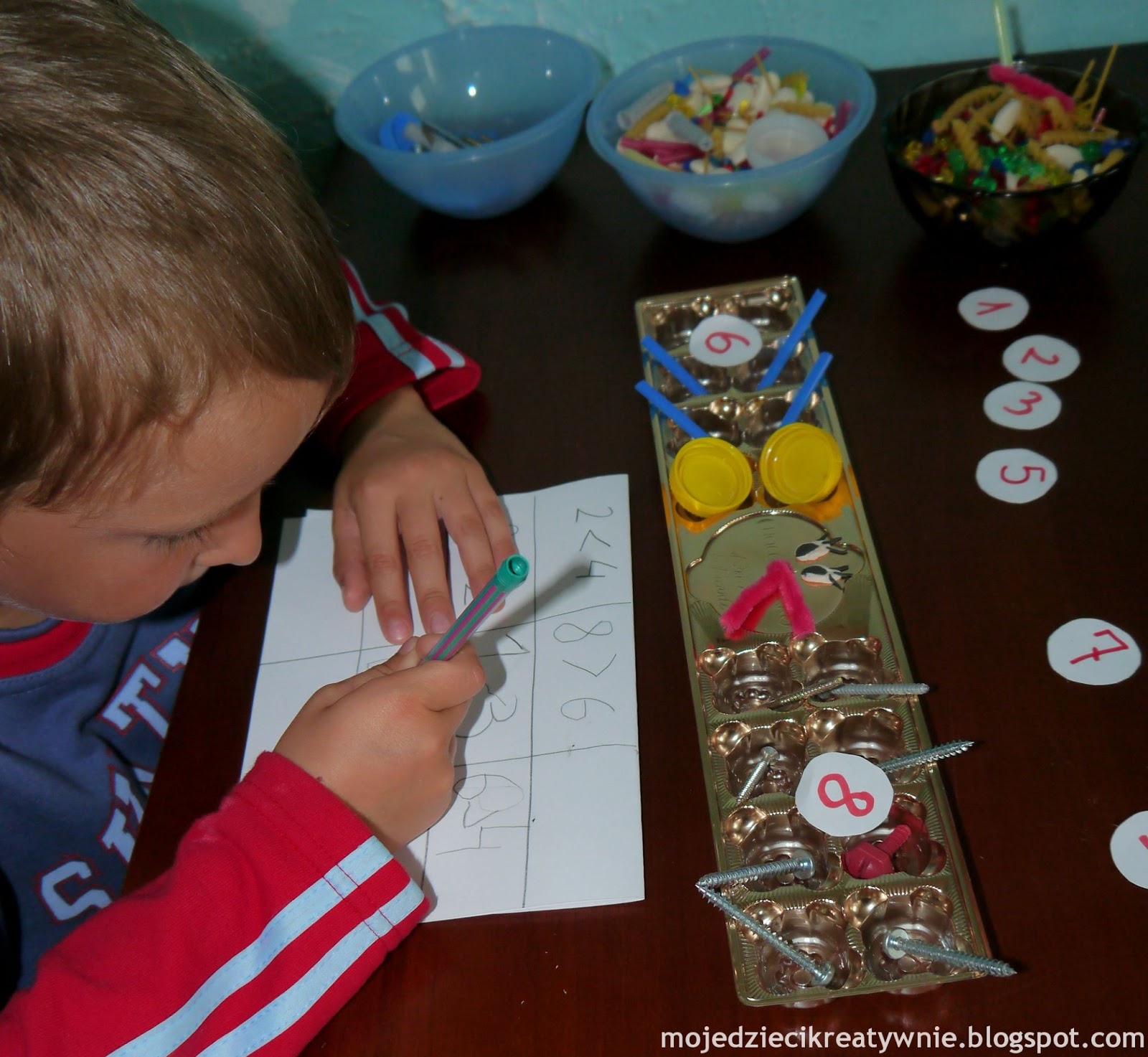 W sam środek wbiłam drucik kreatywny i ułożyłam go w znak większości, który można w zależności od wyniku obracać. Następnie dałam Adasiowi miseczki z różnymi drobiazgami, aby układał po jednej i drugiej stronie kilka rzeczy. Synek liczył je i oznaczał odpowiednią cyferką oraz znakiem większości lub mniejszości.