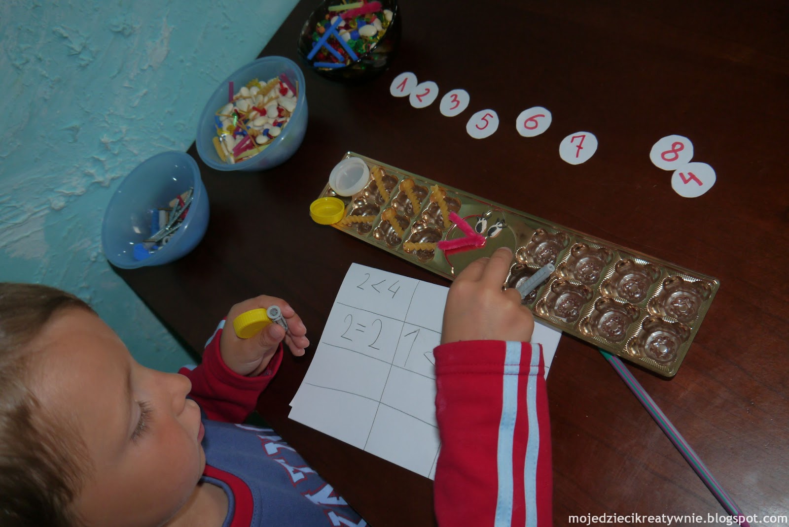 Tym razem postanowiłam z Adasiem trochę się pouczyć. Ostatnio mało liczymy więc wymyśliłam, że z opakowania po bombonierce zrobię naszą maszynkę do liczenia i oznaczania gdzie jest mniej, a gdzie więcej.