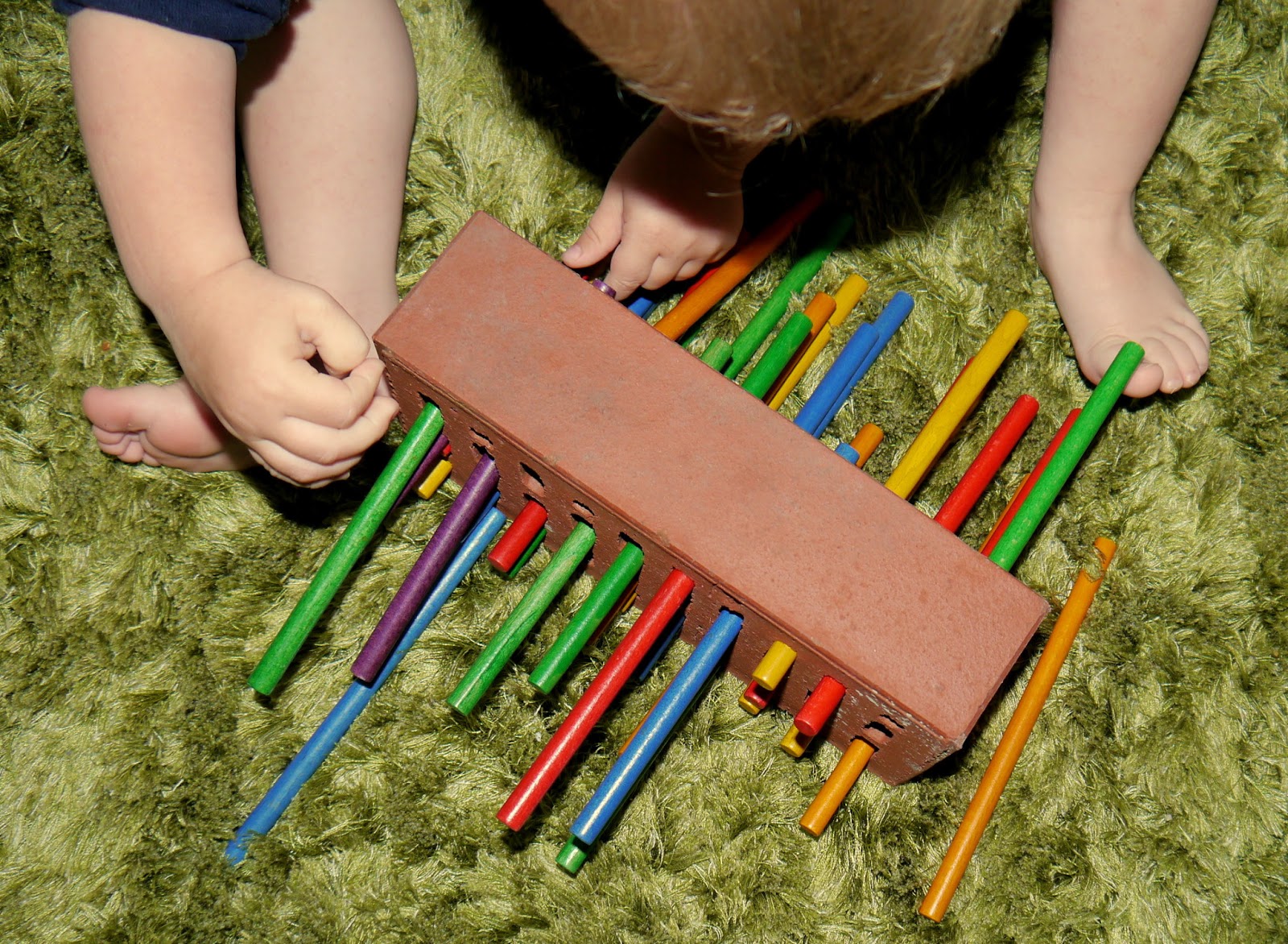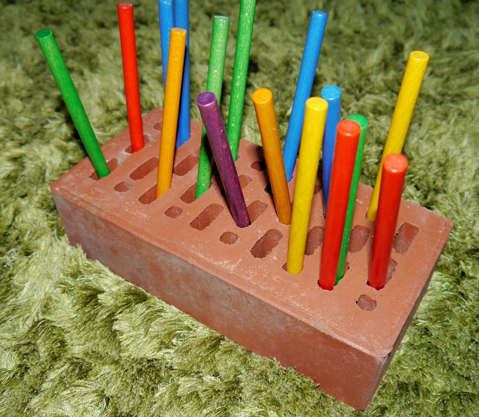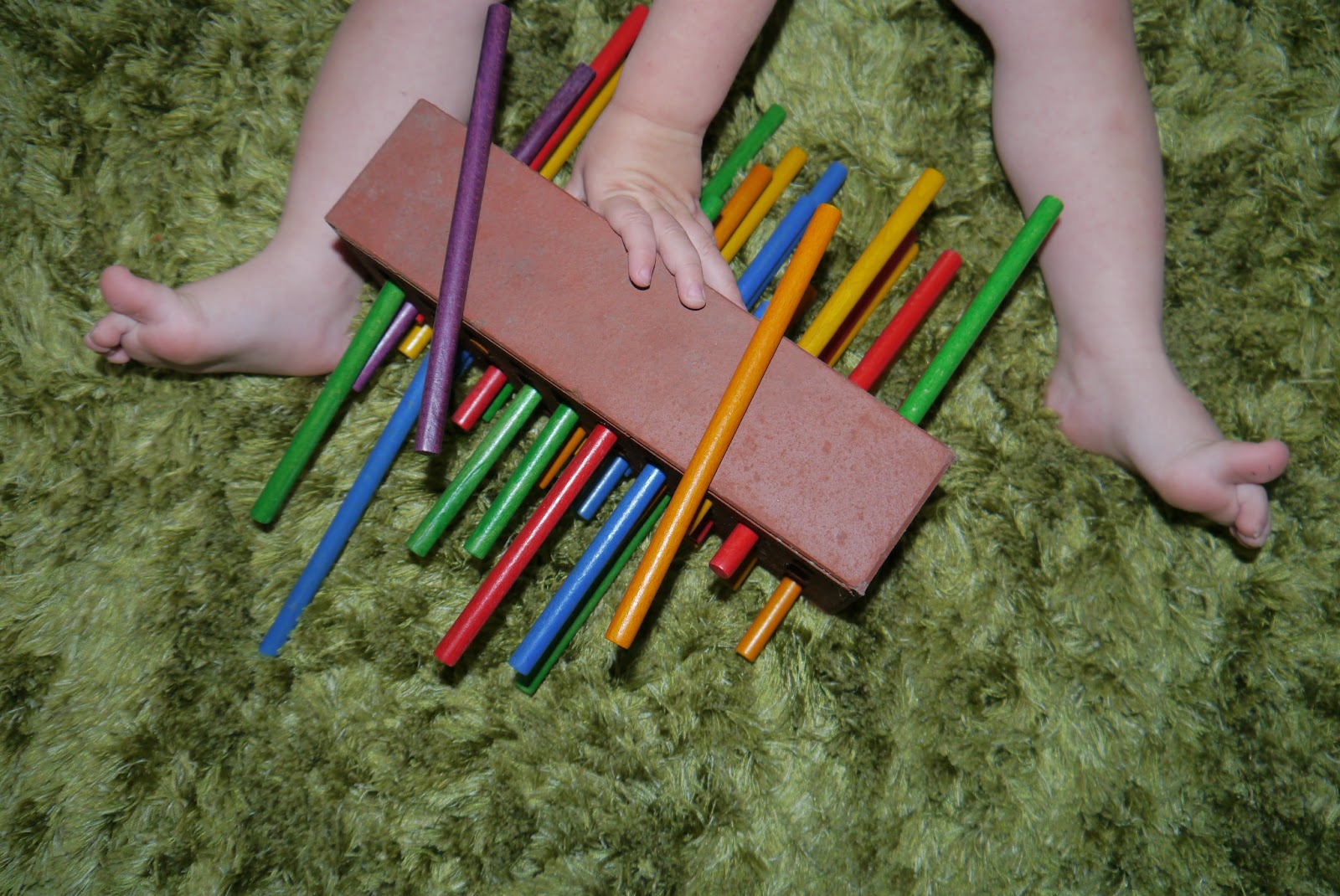 Ostatnio wracając z pracy przytachałam do domu cegłę, położyłam ją w pokoju i poszłam się napić kawy. Więc w tym czasie mój ciekawski Michał zainteresowany cegłą pobiegł do szuflady, wyciągnął opakowanie z drążkami ze Studni Jakuba i woła drzwi, drzwi:-) to znaczy, żeby mu otworzyć:-) po czym biegnie z otwartym opakowaniem do tej cegły i sam wymyślił sobie kreatywną zabawę:-)