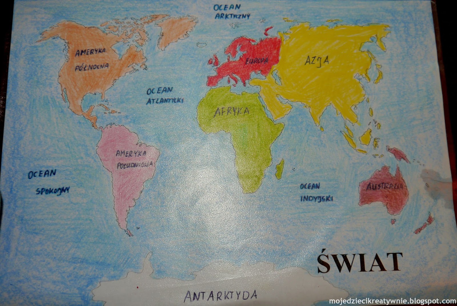 Przy cyferce 1 jest start, a przy liczbie 35 meta, czyli ukryty skarb. Zadanie synka polegało na odnalezieniu drogi do ukrytego skarbu. Przy okazji łączenia ze sobą cyferek i odkrywania drogi powstały nam ciekawe wzory, które Adasiowi przypominały kontynenty. Potem sprawdzaliśmy na naszej kolorowej mapie świata z kontynentami, na którym z nich jest ukryty skarb 🙂