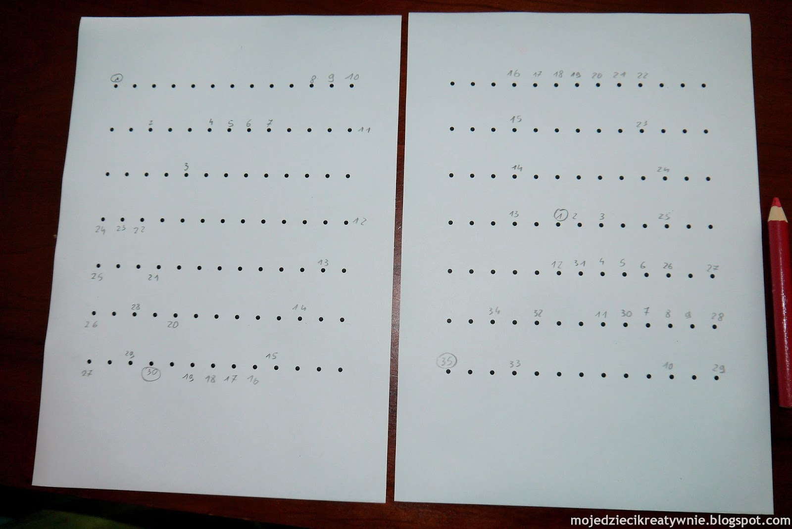 Zabawa przygotowana na szybko, gdy synek się nudził. Ale jak się okazało całkiem przypadła do gustu. Znacie zapewne z wielu książeczek zabawy typu połącz kropki i powstaje nam rysunek. My zabawiliśmy się podobnie tylko dla utrudnienia wydrukowałam kartę całą wykropkowaną.