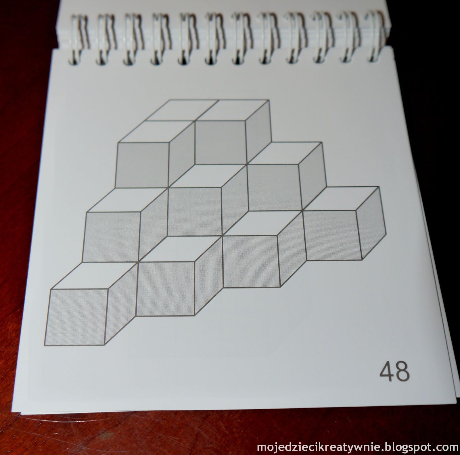 przedstawiające bryły ułożone z klocków w tym samym kolorze, ,,konstrukcje” do ułożenia z dwóch kolorowych klocków, konstrukcje z większej ilości klocków, bez zaznaczenia kolorów.