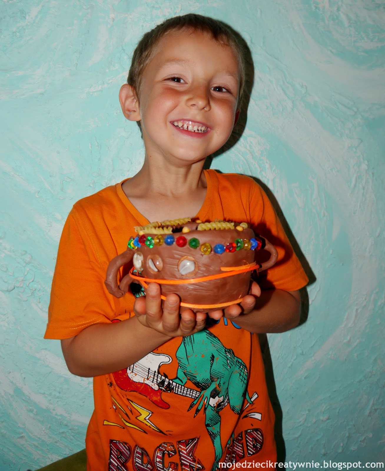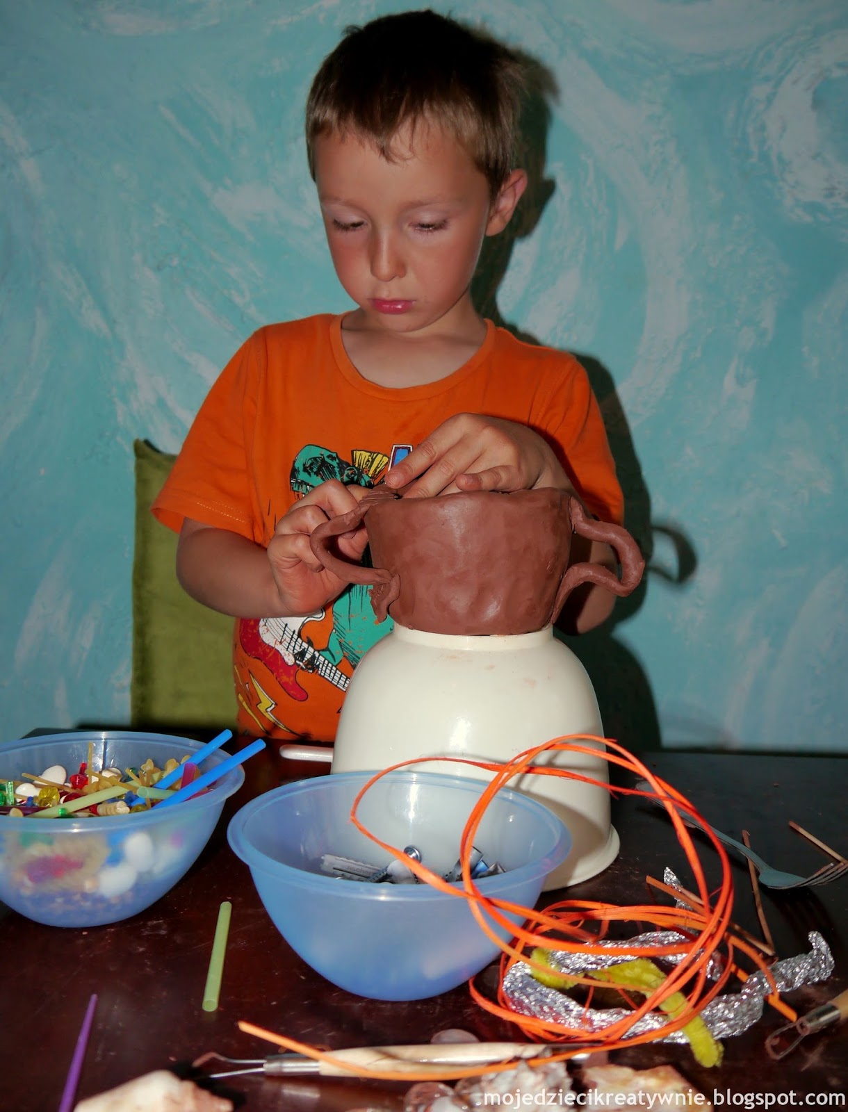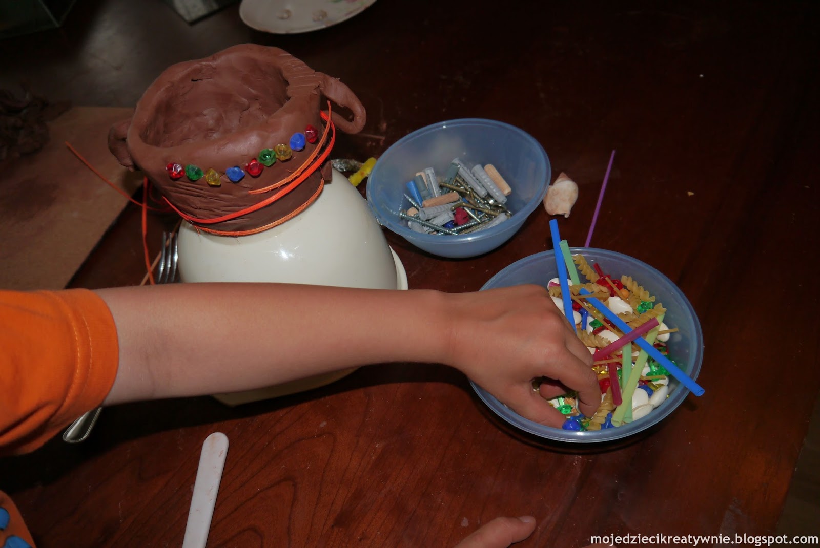 Teraz synek zabrał się za dekorowanie miseczki. Miał do wyboru rożne drobiazgi i własną tylko inwencję:-)