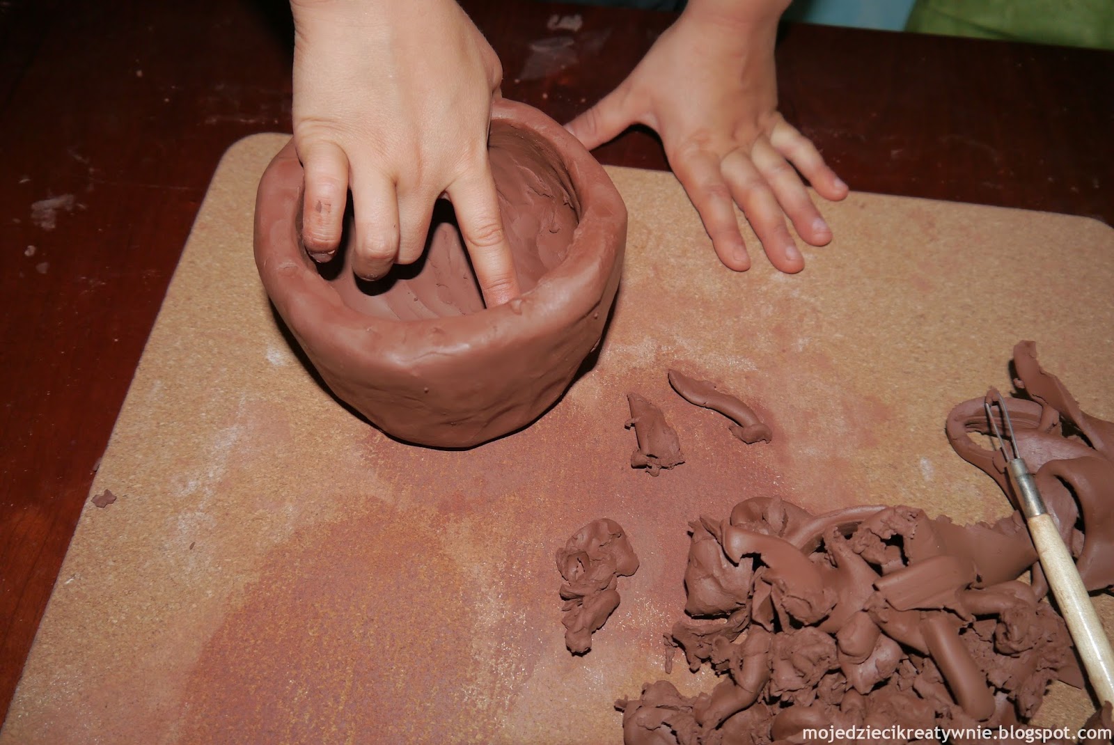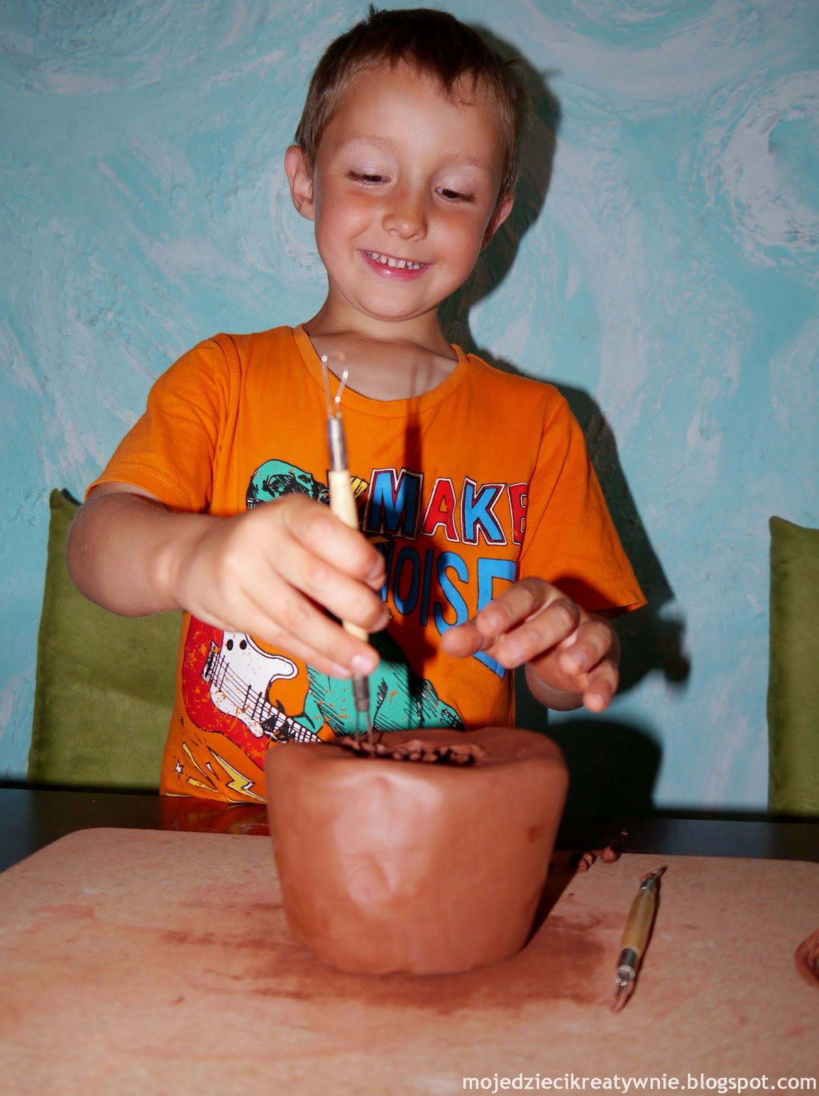 Następnie synek narzędziem ceramicznym, tak zwaną pętelką wybiera ze środka glinę, tak aby nie uszkodzić ścianek dzbanuszka. Bardzo fajne ćwiczenie dla dłoni. ( narzędzia do ceramiki są do kupienia w sklepie dla plastyków za kilka złotych lub można je wykonać samemu)