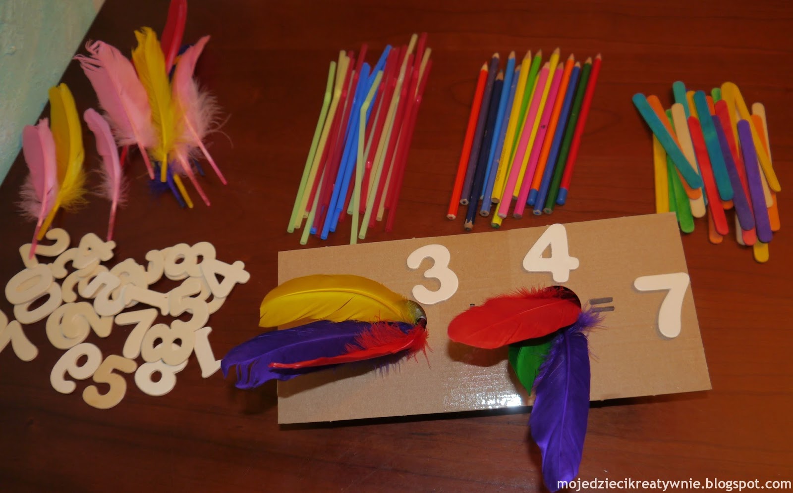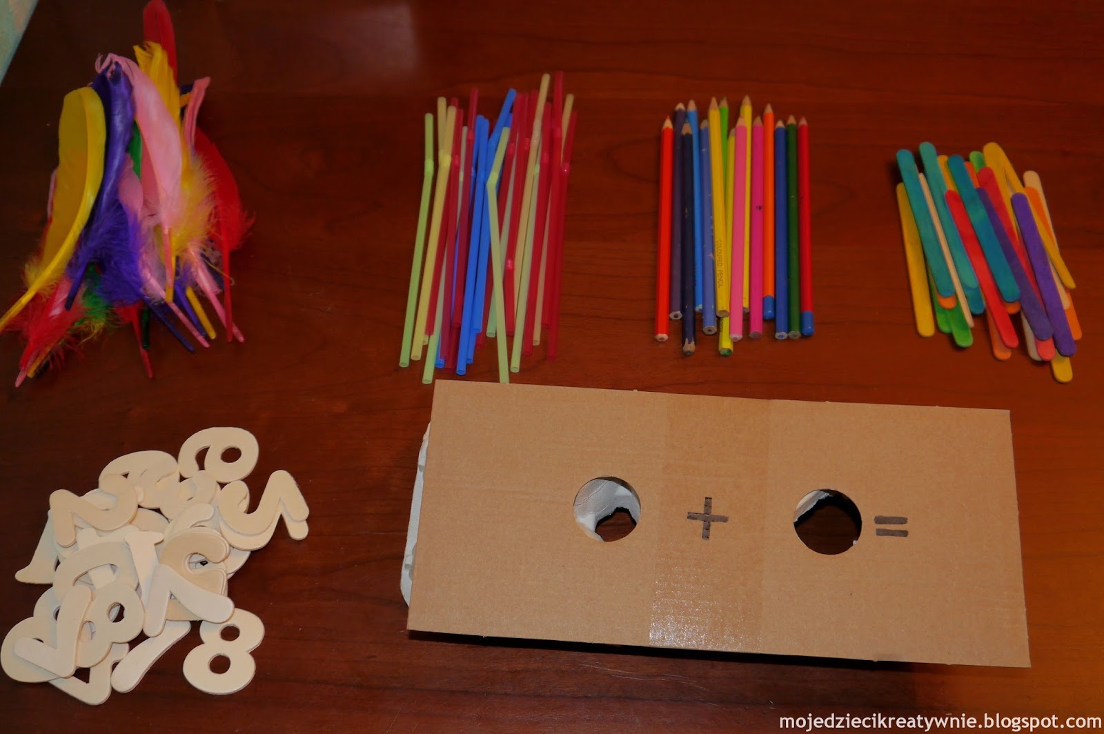 W opakowaniu po jajkach zrobiłam dwa otwory, u góry przykleiłam taśmą klejącą tekturkę i opisałam ją znakami dodawania i równości.