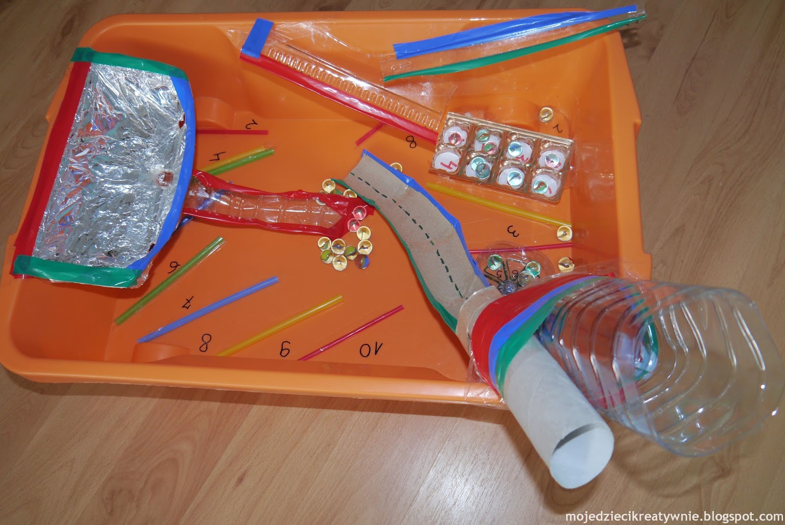 duży karton lub plastikowy pojemnik, taśma klejąca, rolki po papierze, słomki, opakowanie po jajkach, plastikowa butelka, różne pudełka i opakowania:-) czyli wszystko po czym może kulać się kulka. Elementy montujemy taśmą do pudełka, sprawdzamy gdzie i jak toczą się kulki i montujemy wtedy strefy punktowe, poprzez przyklejenie słomek do spodu pudełka. Pudełko może stać na płaskiej powierzchni ale również pod skosem, wtedy jest jeszcze ciekawiej:-)