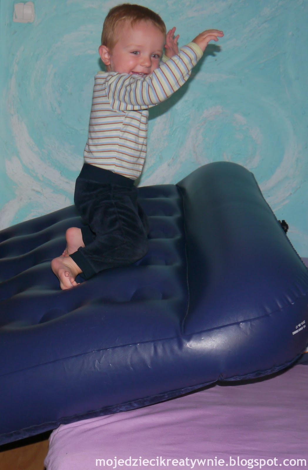 Co pewien czas dmuchamy naszym dzieciom materac, opieramy go pod skosem o łóżko i wtedy zaczyna się prawdziwe szaleństwo. Pomysł takiej zabawy pojawił się, gdy Michał był malutki i bardzo długo nie raczkował oraz nie chodził.