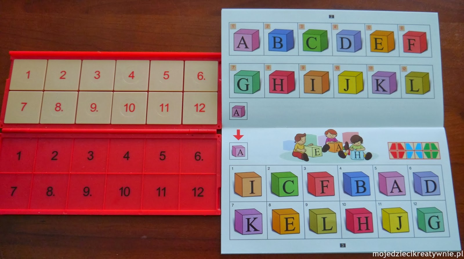 W poręcznym, zamykanym pudełku z plastiku, które nazywamy ,,Zestawem Kontrolnym”, znajduje się 12 ponumerowanych klocków. Klocuszki z jednej strony mają cyferki, a z drugiej fragmenty wzoru, który stopniowo powstaje podczas rozwiązywania 12 zadań.