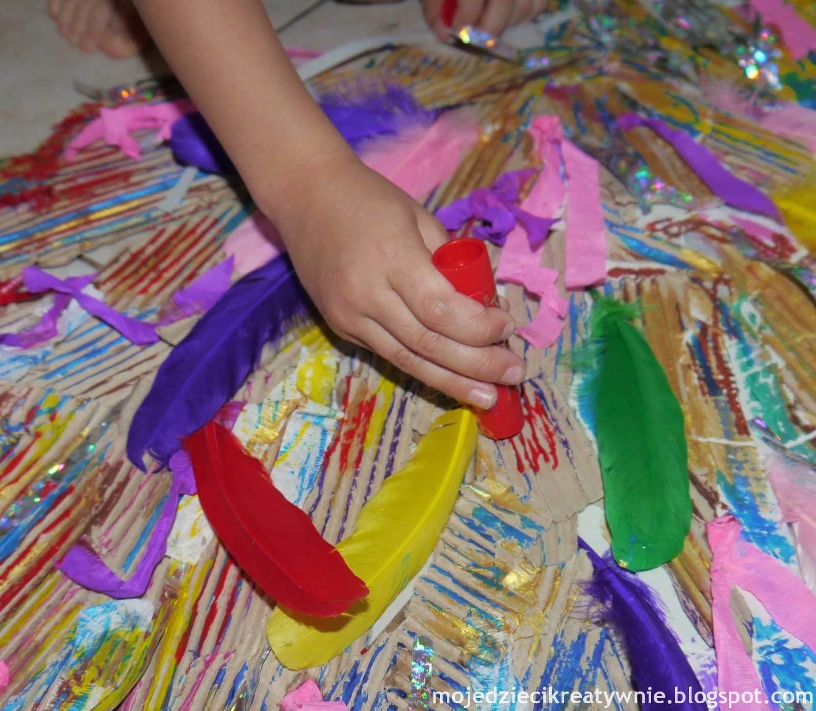 Do malowanie użyliśmy pierwszy raz farbek w sztyfcie. Aktualnie takie farbki są do wygrani w konkursie na moim blogu- serdecznie zapraszam:-). W praktyce farbki okazały się bardzo wygodne, można nimi malować na każdej powierzchni bez użycia wody, coś jak kolorowy klej w sztyfcie. Szybko wysychają i mają ładne żywe kolory. Obawiałam się, że będę mało wydajne i tu miłe zaskoczeni- wcale się szybko nie zużywają:-) Myślę, że to ciekawa propozycja dla małych dzieci do kolorowania oraz tworzenia pięknych wielkoformatowych prac plastycznych czy plakatów. Jedyny minus jest taki, że nie można nimi mieszać barw tak jak w tradycyjnych farbach. Tu nakłada się kolor na kolor bez uzyskiwania szerokiej palety barw. Jednak do stworzenia naszego ptaka i dla małych dzieci, takie farbki sprawdzą się idealnie a uzyskiwane czyste barwy kolorów zachwycą każdego malucha. Adasiowi szczególnie spodobał się odcień złota w farbkach metalicznych jest fantastyczny:-)