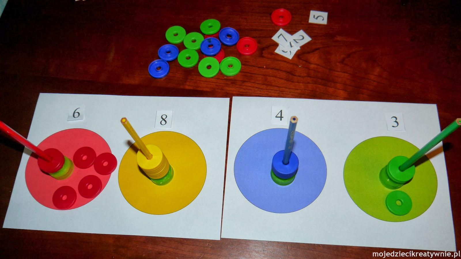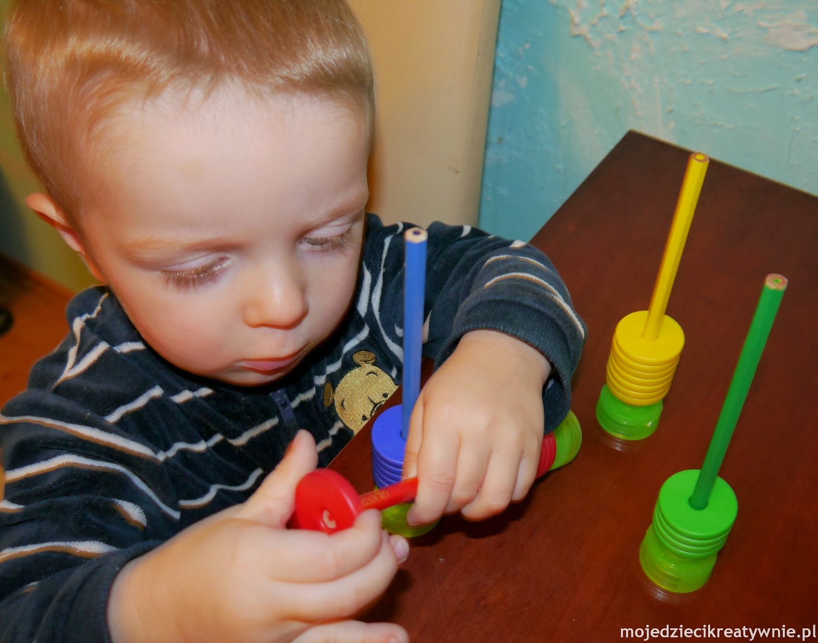 Kolejna ciekawa zabawa, to przerzucanie krążków z jednej kredki na drugą. Do tej czynności potrzeba odrobiny precyzji i… gotowe!:-)