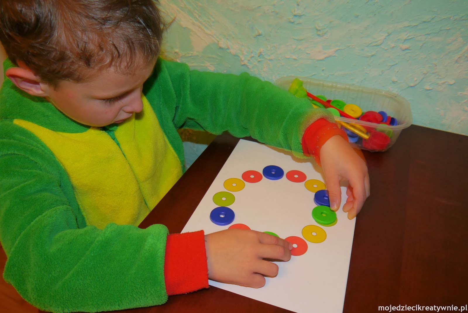 Krążki możemy również przewlekać jak guziczki, oraz nawlekać na sznurki, lub druciki kreatywne. Takie zabawy dostarczą dziecku wiele radości,