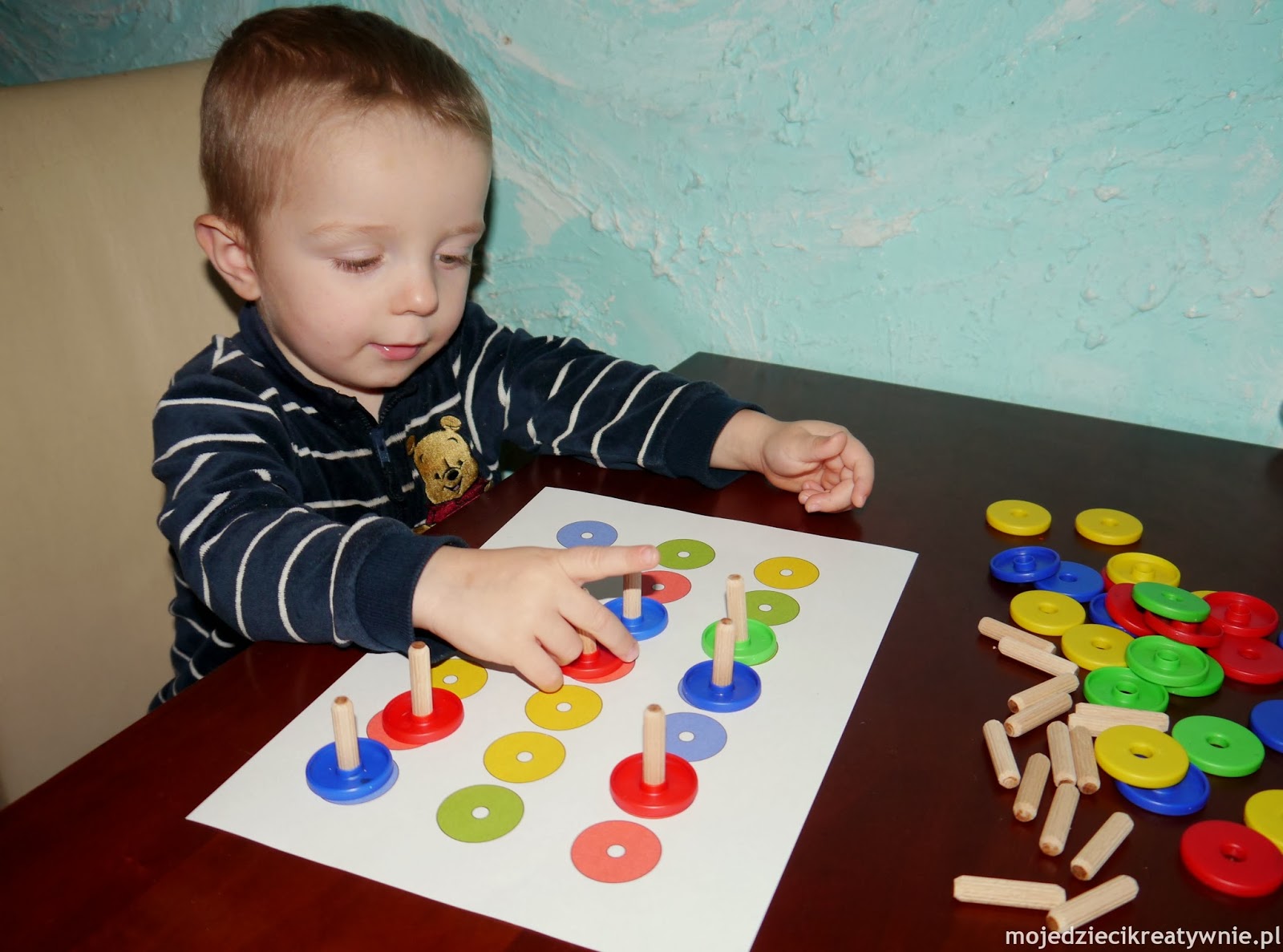 Edukrążki mają przyjazny dla dziecka kształt oraz wielkość. Wszelkie zabawy z ich użyciem doskonale rozwijają zdolności manualne małego dziecka. Do zabawy w sortowanie krążków według kolorów wykorzystałam nakrętki od butelek do picia z dziubkiem, idealnie pasowały do kredek jako stojaczki. W ten sposób Michałek na kredki w czterech kolorach nadziewał odpowiednie krążki. Staraliśmy się liczyć, nazywać kolory i przy okazji trenowaliśmy małą motorykę.