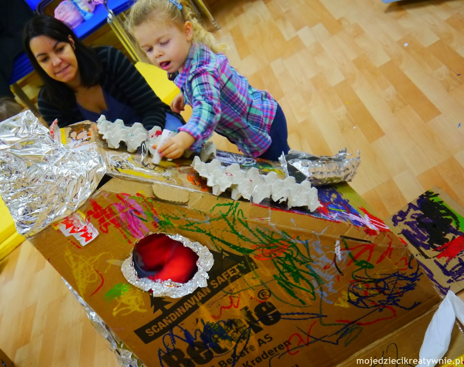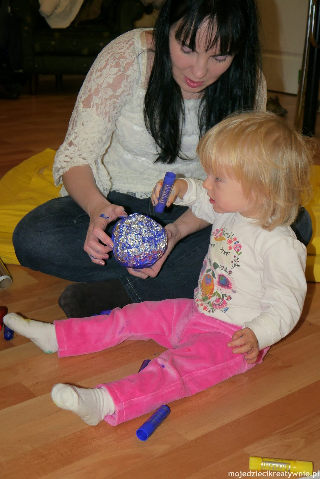 Wspólnie z dziećmi staraliśmy się poznać trochę układ planetarny. Każde dziecko wylosowało nazwę planety i wspólnie z rodzicami wykonywało makietę. Zgniataliśmy w kule na kształt planet papier toaletowy starając się zachować odpowiednie proporcje. Następnie papierowe kule owijaliśmy folią aluminiową i malowaliśmy farbkami. Z foli zrobiliśmy również gwiazdki oraz komety. Po zakończonej pracy ułożyliśmy nasze planety w układzie słonecznym według kolejności. Biegaliśmy w kółko wokół słońca udając, że jesteśmy planetami:-) Dzieci rzucały kometami, a następnie każdy spróbował polecieć naszą rakietą, która powstała również podczas tego spotkania. Każdy mały astronauta mógł popatrzeć przez okienko statku kosmicznego na stworzony układ planet i gwiazdy. Bawiliśmy się również chustą animacyjną, wachlując i kulając po niej nasze planety, a na koniec spacerowaliśmy po księżycu. Serdecznie dziękuję za wspaniale spotkanie, było bardzo wesoło i twórczo. Dzieci pięknie pracowały, a rodzice dopingowali je i również z zaangażowaniem sami tworzyli.