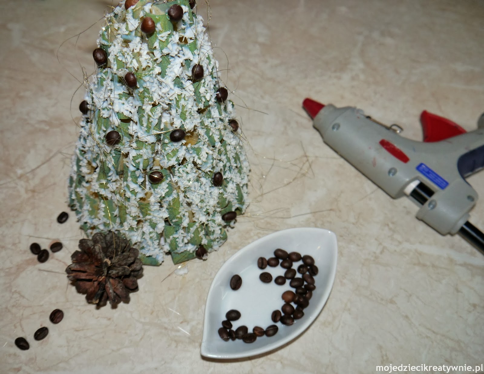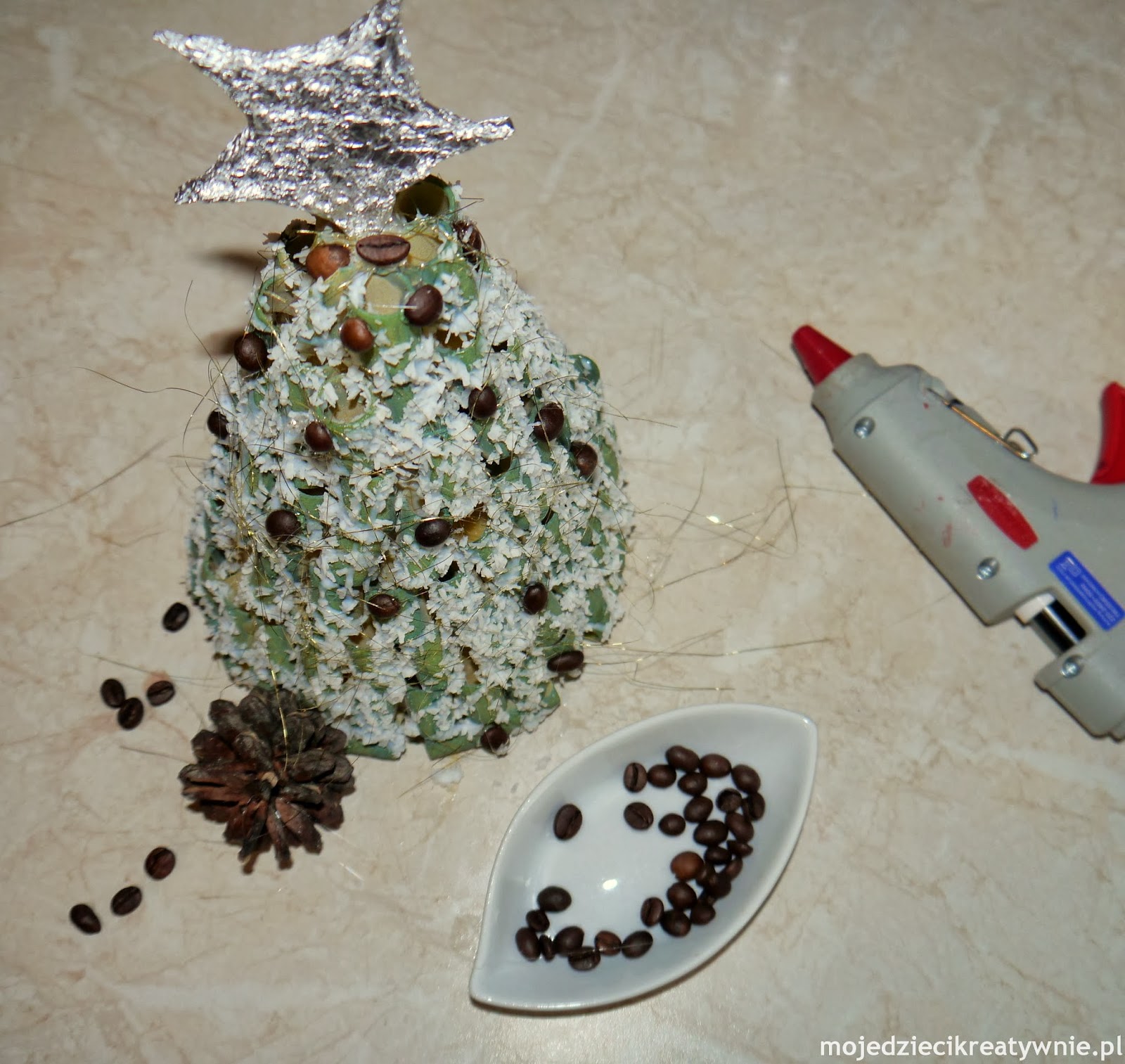 W kolejnym etapie przyklejamy za pomocą kleju na gorąco ziarenka kawy, szyszkę i gwiazdę:-)