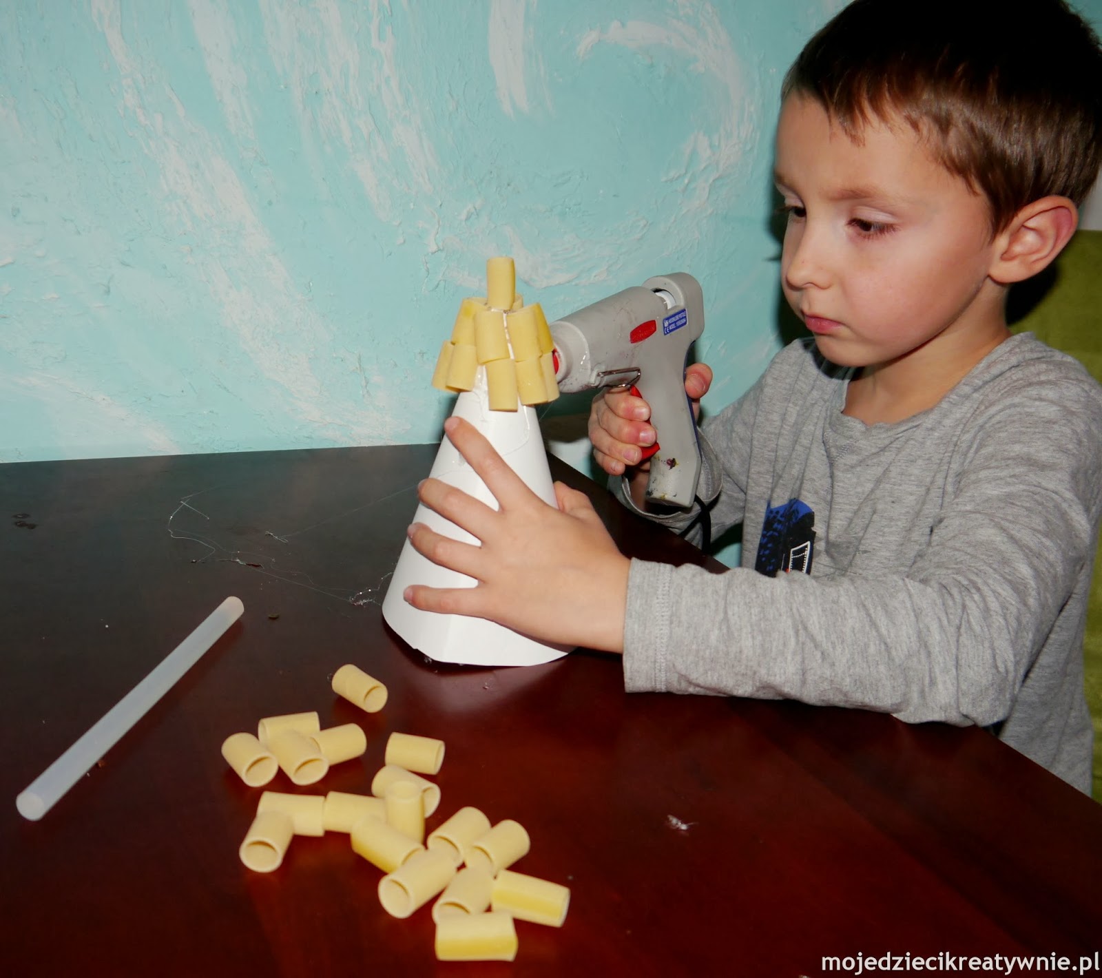Stożek zrobiłam ze sztywnej kartki papieru. Adaś zajął się przyklejaniem na choinkę makronu.